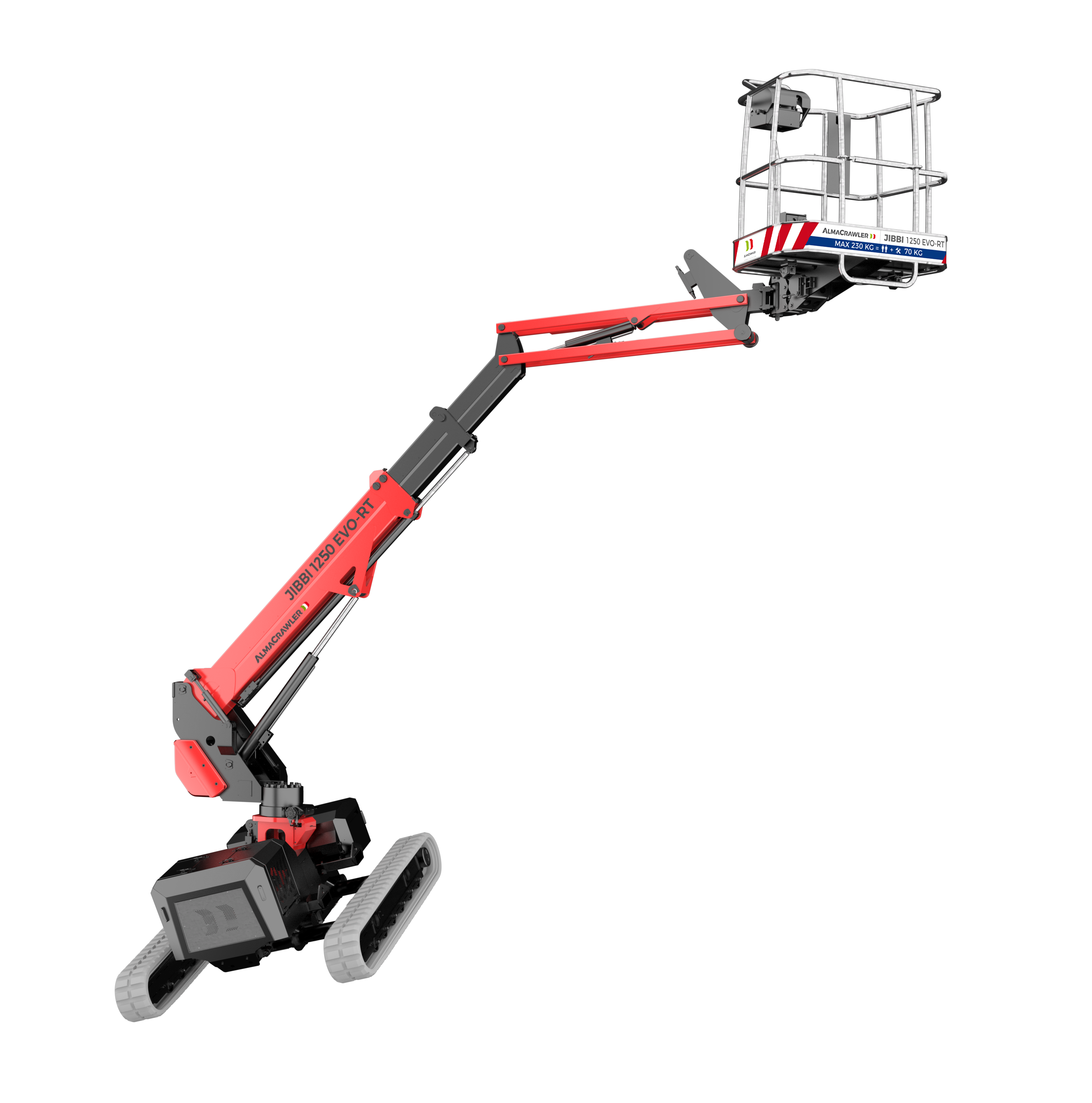 Having continuously improved and modernised its technologies, AlmaCrawler can now offer JIBBI 1250 EVO-RT, a self-propelled crawler with an excellent bi-levelling system produced by the company, a telescopic boom and a fixed carriage designed by the internal team. The machine can reach a maximum working height of 12.3 metres and it differs from the previous versions – 1250 EVO, 1250 ELC and 1250 LTH – for the presence of a greater front and lateral outreach, that is 7.0 m on both sides.